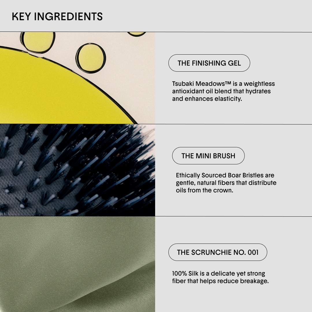 Este set es un trío diseñado para lograr el peinado estilo “slick-back” (pulido hacia atrás). Está pensado para desenredar el cabello, controlar el frizz, dar un acabado pulido y mantener cada hebra en su lugar.