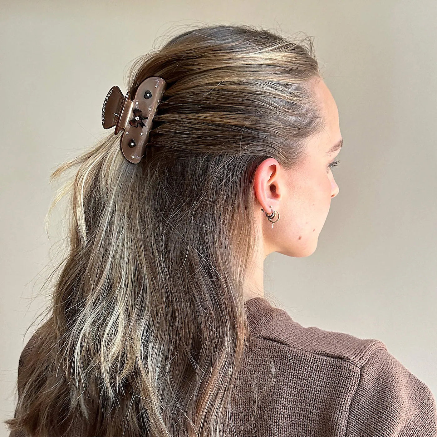 Color Cocoa Cashmere: base mocha con corazones negros, moño carey y toques de cristales brillantes.