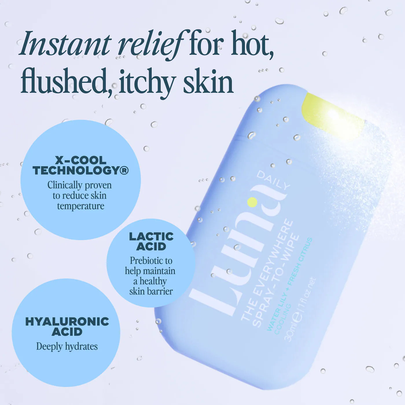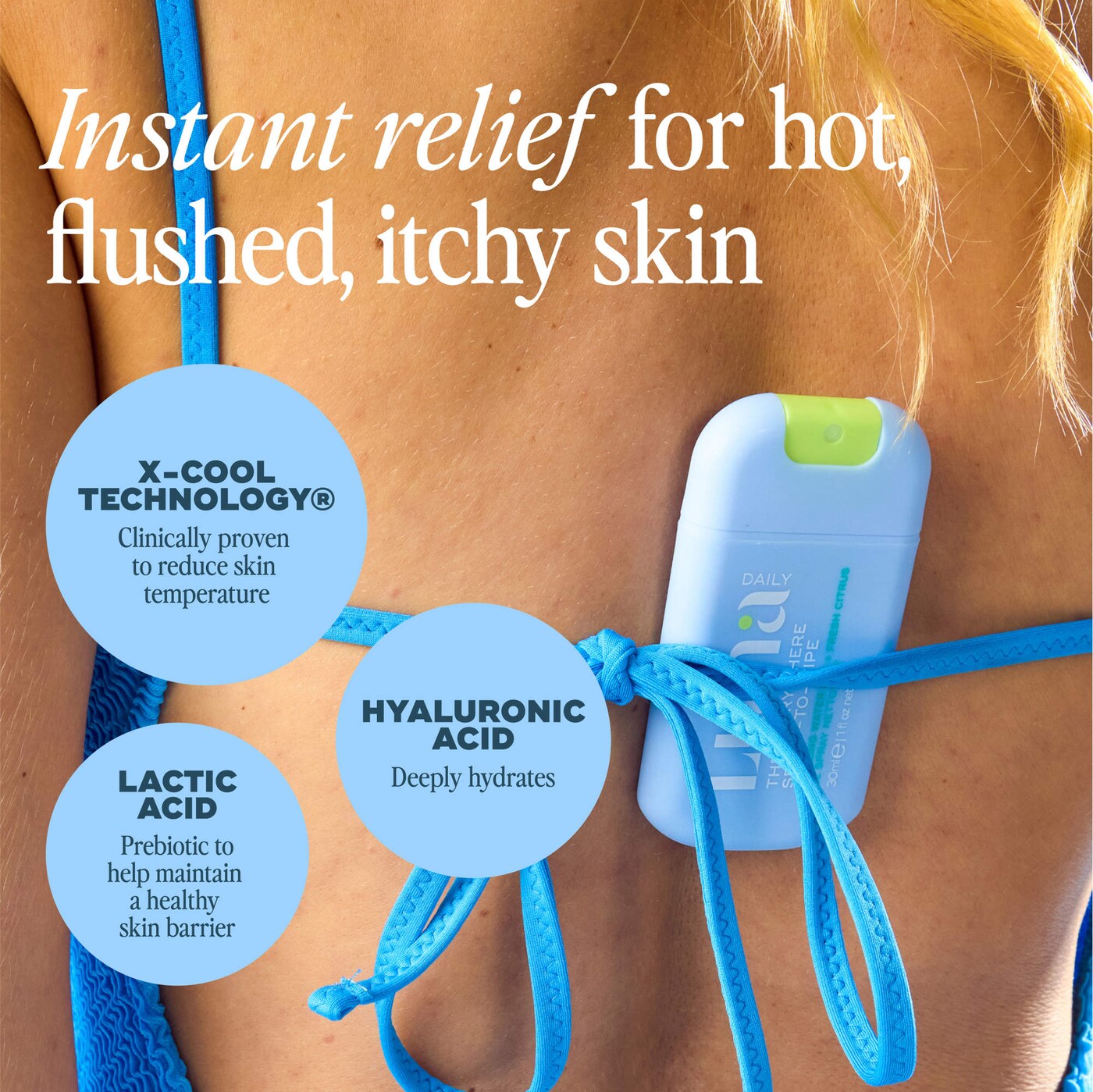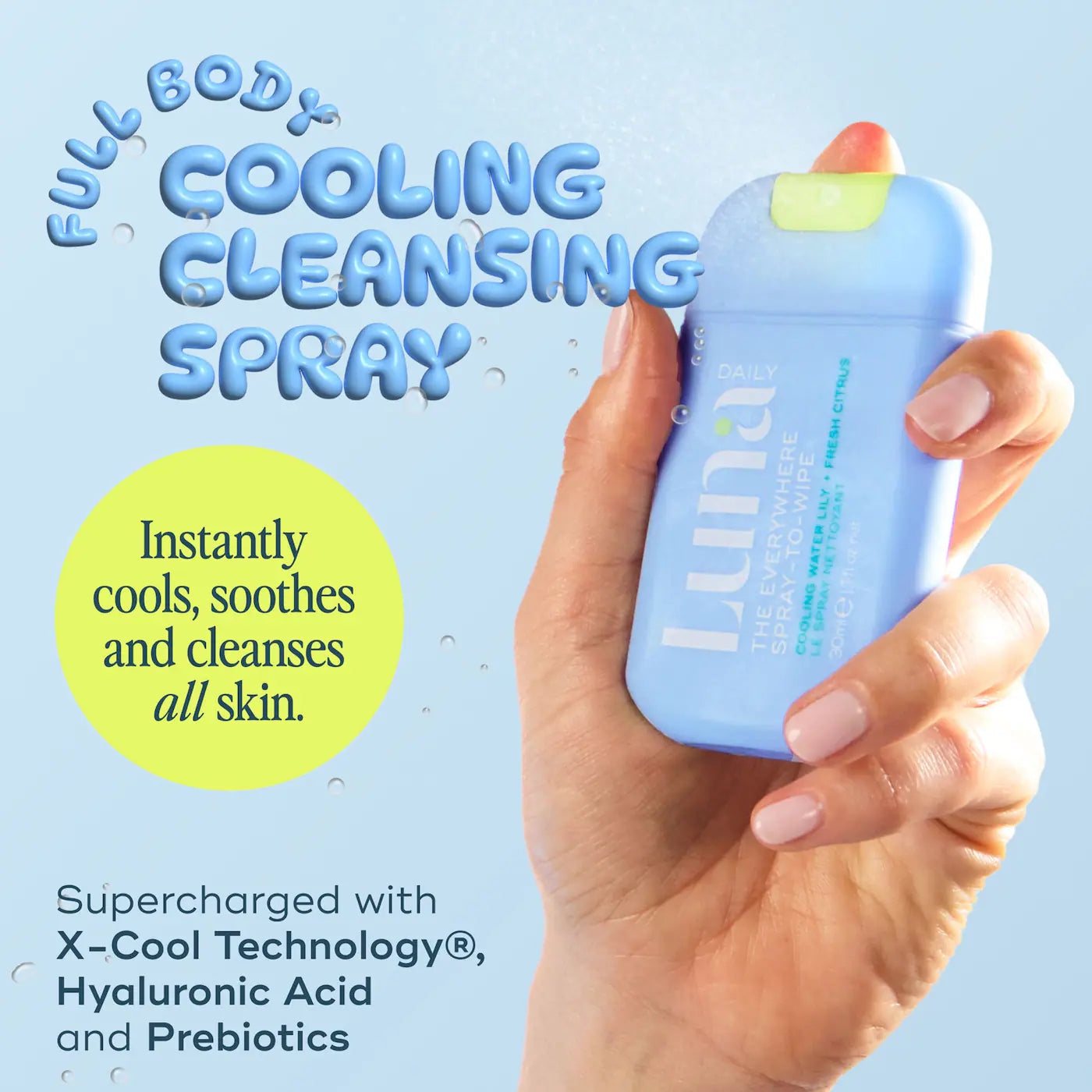Un spray corporal de bolsillo que limpia, refresca e hidrata al instante, ideal para piel caliente, irritada o con comezón.