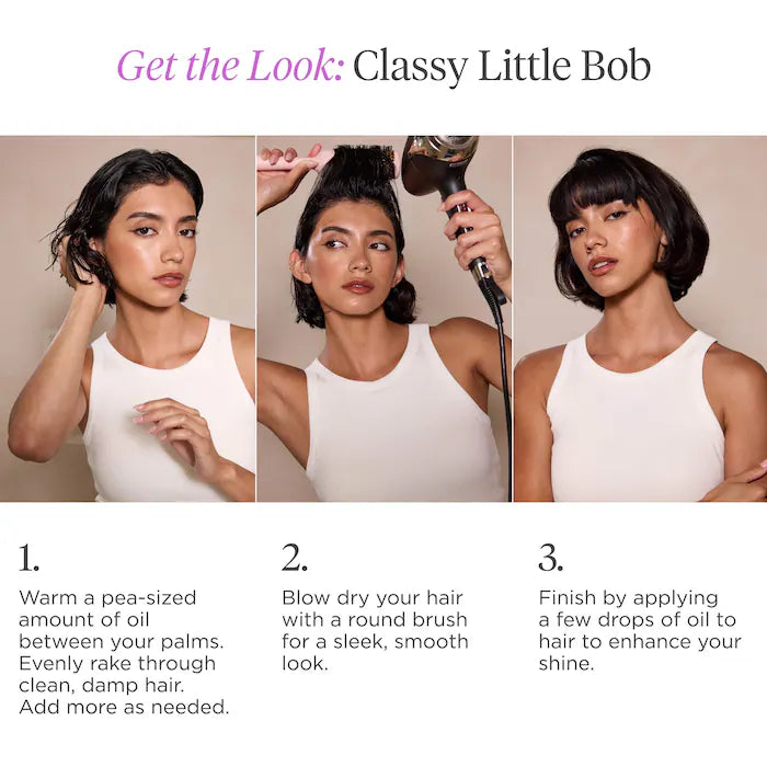 Formulado con un 99% de ingredientes naturales, este aceite sin silicona revitaliza el cabello seco y opaco con hidratación y un acabado brillante. Ideal para uso diario en cabellos medianos a gruesos, o para peinados pulidos en cabellos finos a medianos.