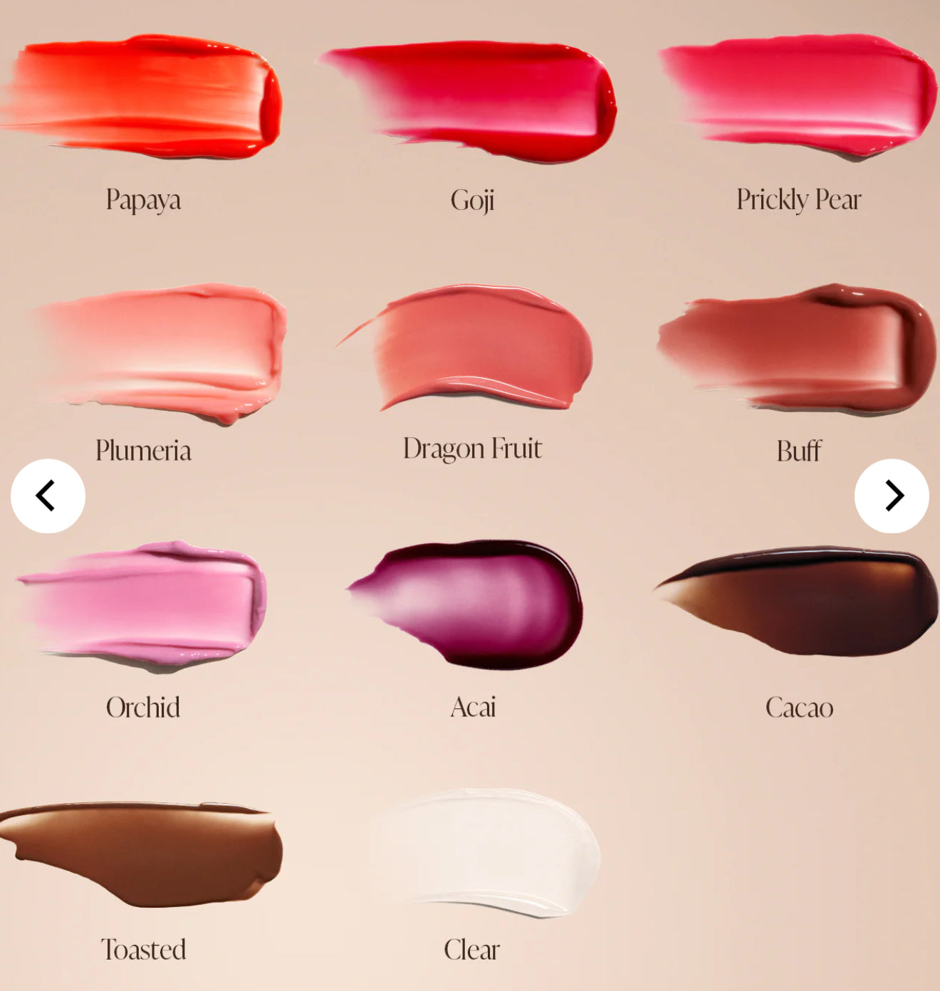 Es un aceite labial con textura de bálsamo que hidrata, suaviza y protege los labios mientras les da un brillo natural, no pegajoso.