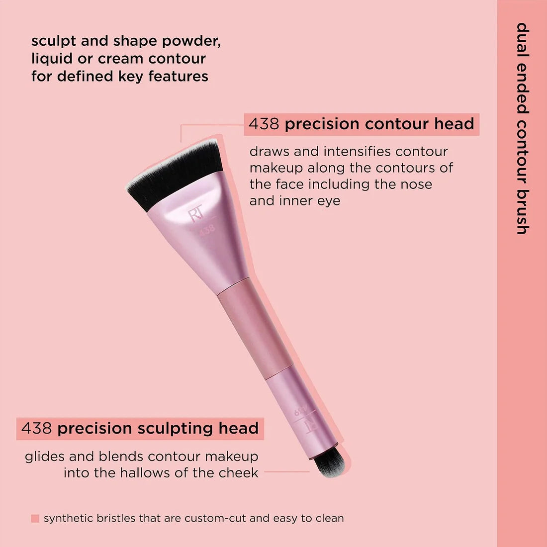 El pincel de doble punta para esculpir y dar forma de Real Techniques combina la escultura de precisión 438 y los contornos de precisión 439 para esculpir y dar forma al contorno en polvo, líquido o crema para características clave definidas. Fabricado con cerdas sintéticas cortadas a medida y fáciles de limpiar.