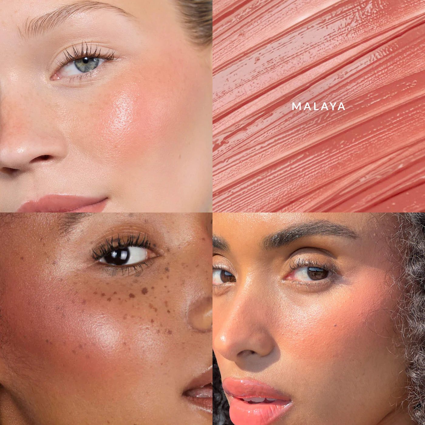 Set edición limitada que incluye dos rubores en crema tamaño completo en los tonos Cherry y Malaya, junto con la brocha doble Duo Brush para una aplicación fácil y uniforme.