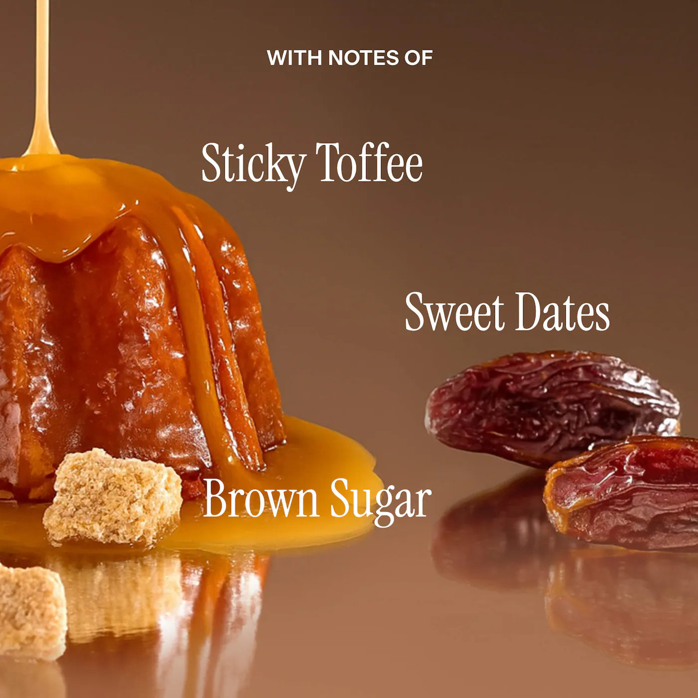 Una fragancia acogedora, cálida y adictiva, con notas de dátiles dulces, toffee pegajoso y azúcar morena que envuelven la piel con un toque dorado y elegante.