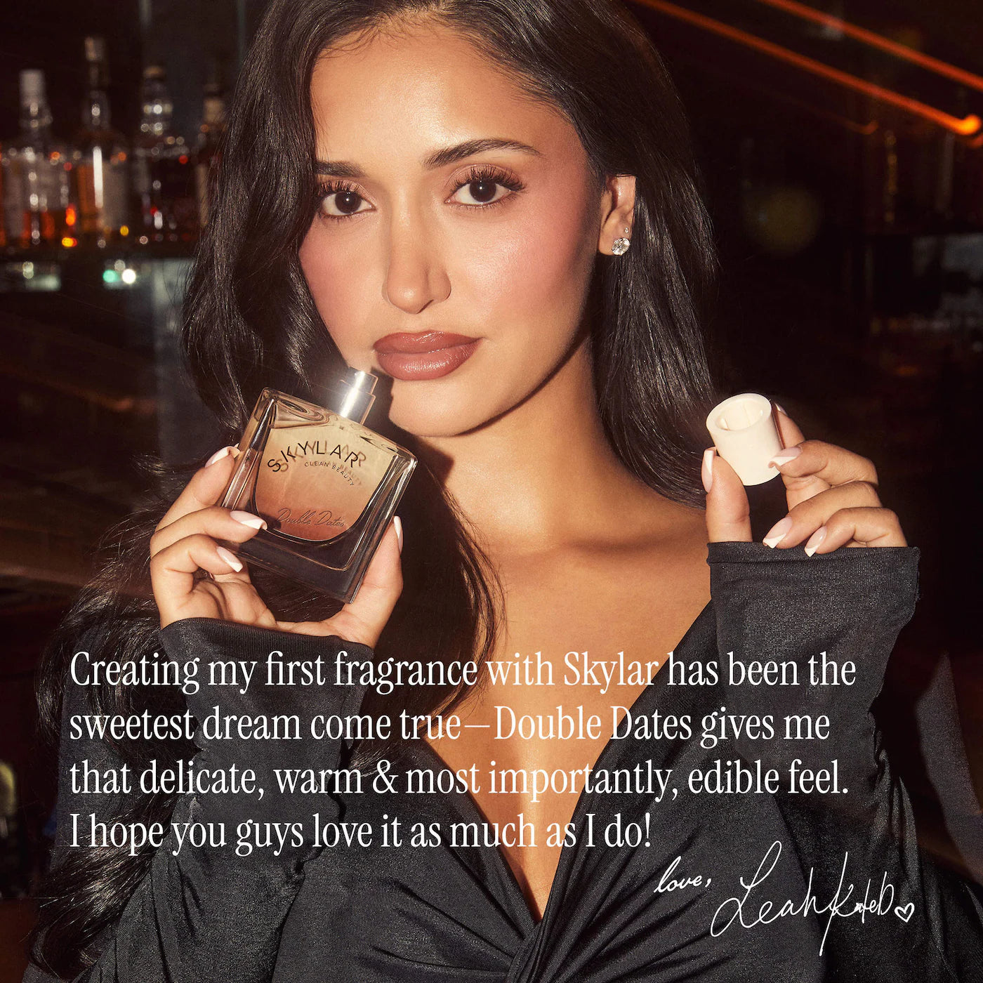“Crear este perfume ha sido un sueño hecho realidad. Double Dates tiene ese toque cálido, delicado y comestible que amo. ¡Espero que lo disfruten tanto como yo!” – Leah Kateb