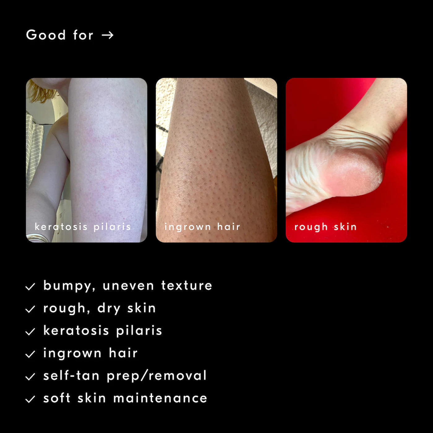 Combate asperezas, protuberancias, queratosis pilar y vellos encarnados.